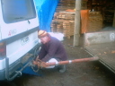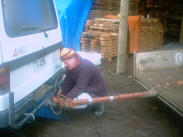 | 朝8時30分、イーァンの仕事は四駆ワゴンに、鉄骨フレームのトレーラーをつなぐ事から始まる。 |