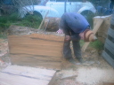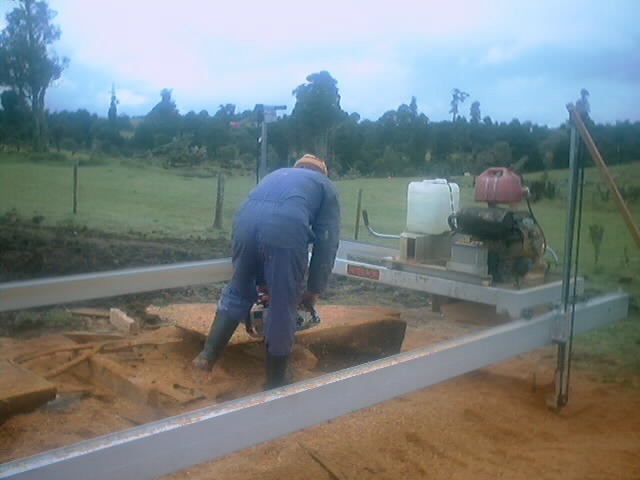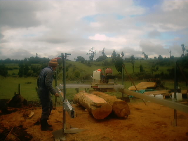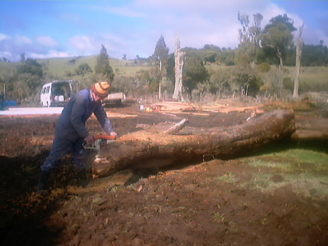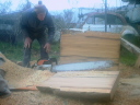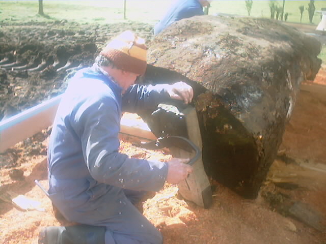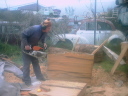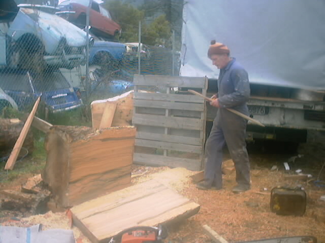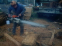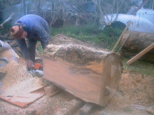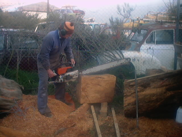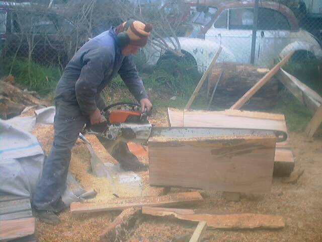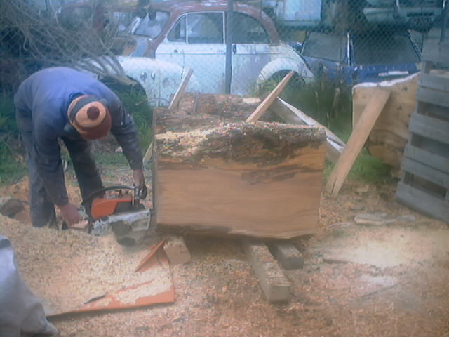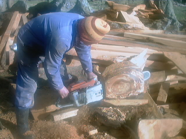 | 1メートル長のチェンソーバーでストレートカット 山の牧場から戻った4日後選び抜いた材料をカット。 素材は、ブラックマイリー |
