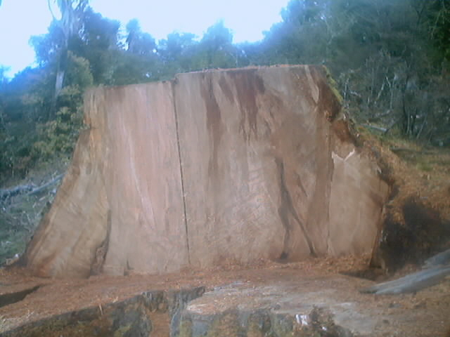 | リムーの切り株、130年振りにノコギリが入った巨木の根、底辺の直径480センチ 底辺×高さ÷2 と言ってカットしている訳では無くて、 130年もの間にひび割れ、腐敗、侵食等不要の部分をカットしているのです。 |